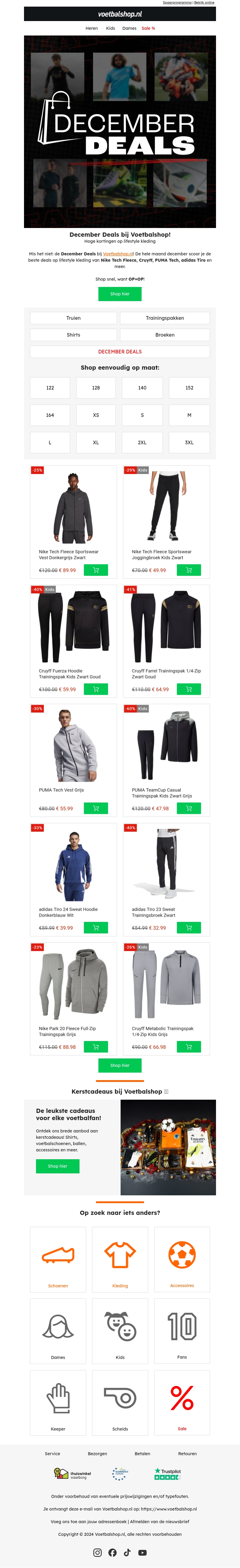 Mis de unieke December Deals niet bij Voetbalshop! Ontdek kortingen tot wel 45% op topmerken zoals Nike, PUMA en Cruyff. Prachtige cadeaus voor de feestdagen met de nieuwste collecties. Alleen deze maand geldig, dus sla je slag voor de beste prijzen. Shop nu en verras jezelf en je geliefden.