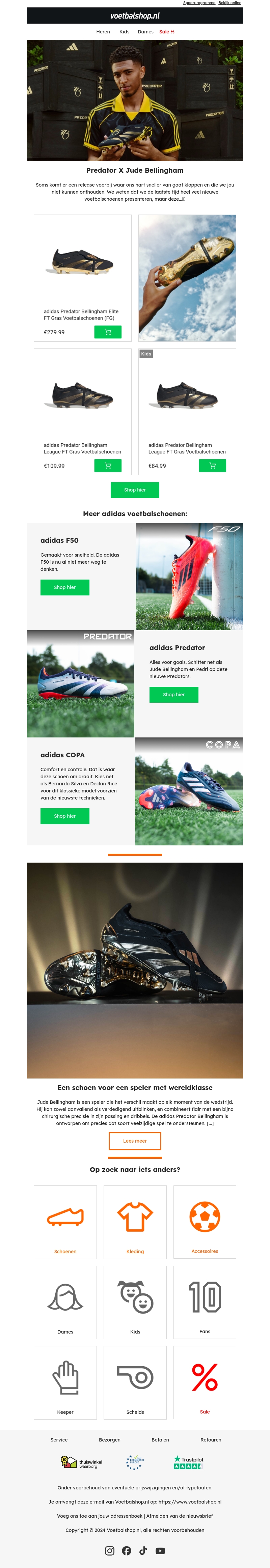 Mis de nieuwste samenwerking niet met de Predator X Jude Bellingham collectie. Deze schoenen zijn ontworpen om het beste uit je spel te halen, met geavanceerde technologieën voor maximale prestaties. Ontdek verschillende varianten, zoals de Predator Bellingham Elite en de Liga. Bekijk ook andere populaire adidas-modellen, waaronder de F50, Predator en COPA. Perfect voor wie op zoek is naar snelheid, comfort en controle op het veld.