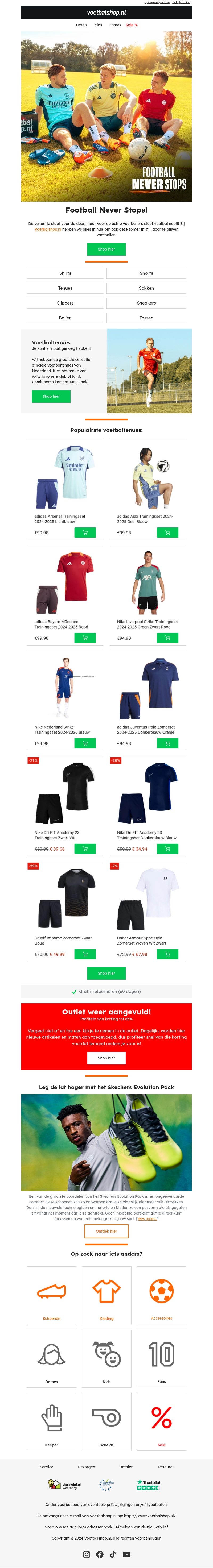 De vakantie staat voor de deur, maar dat betekent niet dat voetbal stopt! Bij Voetbalshop vind je alles wat je nodig hebt om door te blijven spelen, van shirts en shorts tot schoenen en ballen. Ontdek nu de nieuwste collecties en profiteer van de beste aanbiedingen.