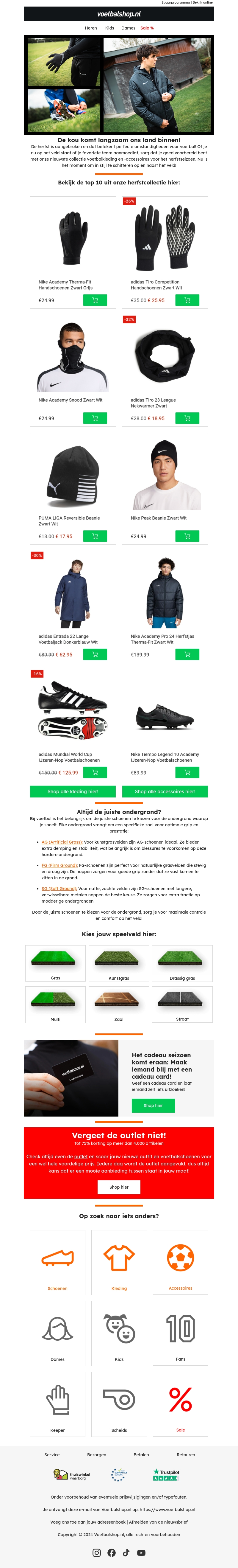 De herfst is in aantocht en Voetbalshop.nl heeft alles wat je nodig hebt om warm en comfortabel te blijven. Ontdek handschoenen, sjaals en meer in onze nieuwe collectie. Vergeet niet onze speciale aanbiedingen te bekijken en scoor je favoriete stukken voor minder. Mis de kans niet om stijlvol op het veld te verschijnen!