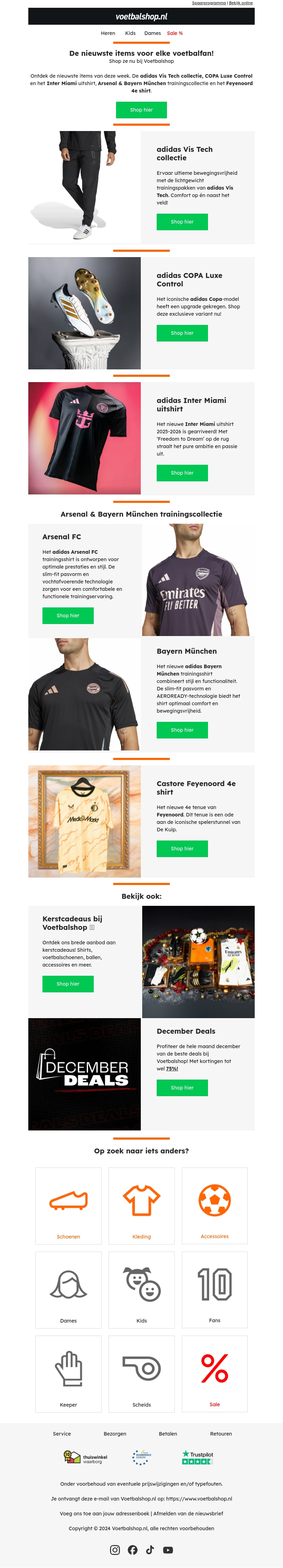Deze week presenteren we de nieuwste items voor elke voetbalfan. Van de stijlvolle adidas Vis Tech collectie tot de exclusieve COPA Luxe Control schoenen, er is voor ieder wat wils. Ook hebben we speciale clubitems zoals het Arsenal & Bayern München trainingscollectie en het Feyenoord 4e shirt. Mis deze kans niet om je collectie uit te breiden!