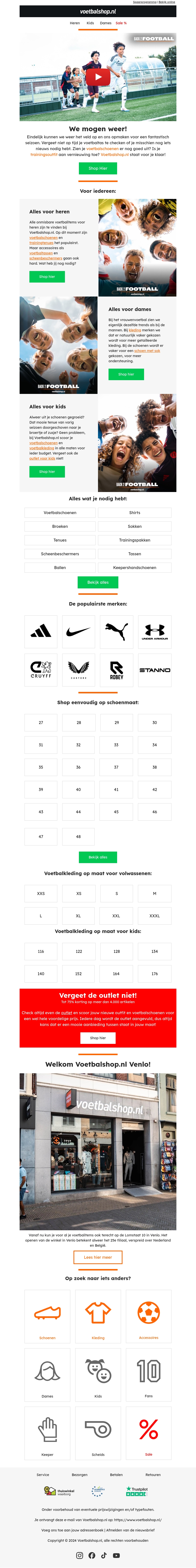 We mogen weer voetballen! Is jouw voetbaltas nog compleet? Zorg ervoor dat je alles hebt wat je nodig hebt voor het nieuwe seizoen. Ontdek onze nieuwste collectie voor heren, dames en kids. Bezoek Voetbalshop.nl Venlo voor persoonlijke service!
