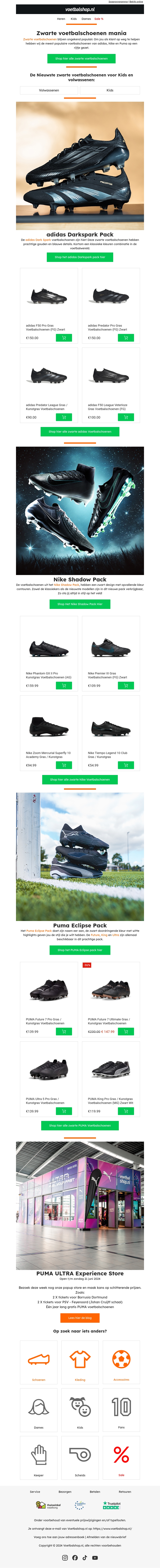 Welkom bij de Zwarte Voetbalschoenen Mania! We hebben de nieuwste collecties voetbalschoenen van onder andere adidas, Nike en Puma voor je op een rij gezet. Ontdek nu de nieuwste trends en scoor jouw perfecte paar. Bezoek ook onze PUMA ULTRA Experience Store voor exclusieve deals.