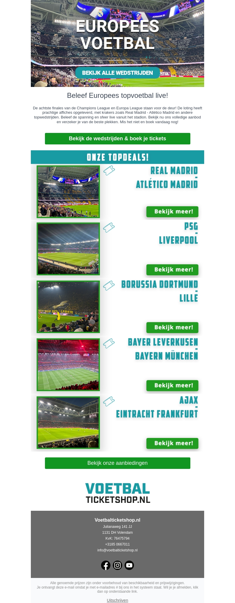 De spannende wedstrijden van de Champions League en Europa League komen eraan. Beleef topwedstrijden zoals Real Madrid tegen Atlético Madrid live. Zorg ervoor dat je de beste plekken krijgt voor een onvergetelijke ervaring. Bekijk ons aanbod en boek vandaag nog!