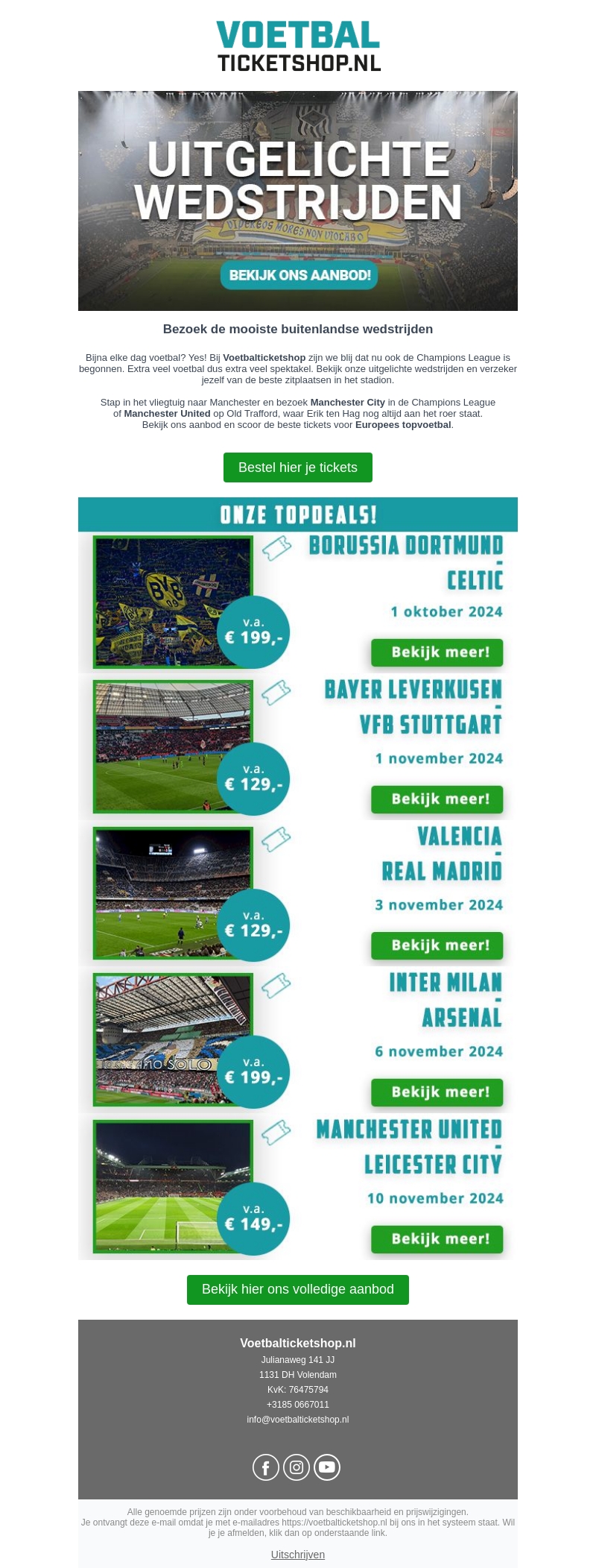 Het voetbalseizoen is begonnen! Bij Voetbalticketshop kun je de mooiste buitenlandse wedstrijden bezoeken. Bekijk onze topaanbiedingen en verzeker jezelf van de beste zitplaatsen in het stadion.