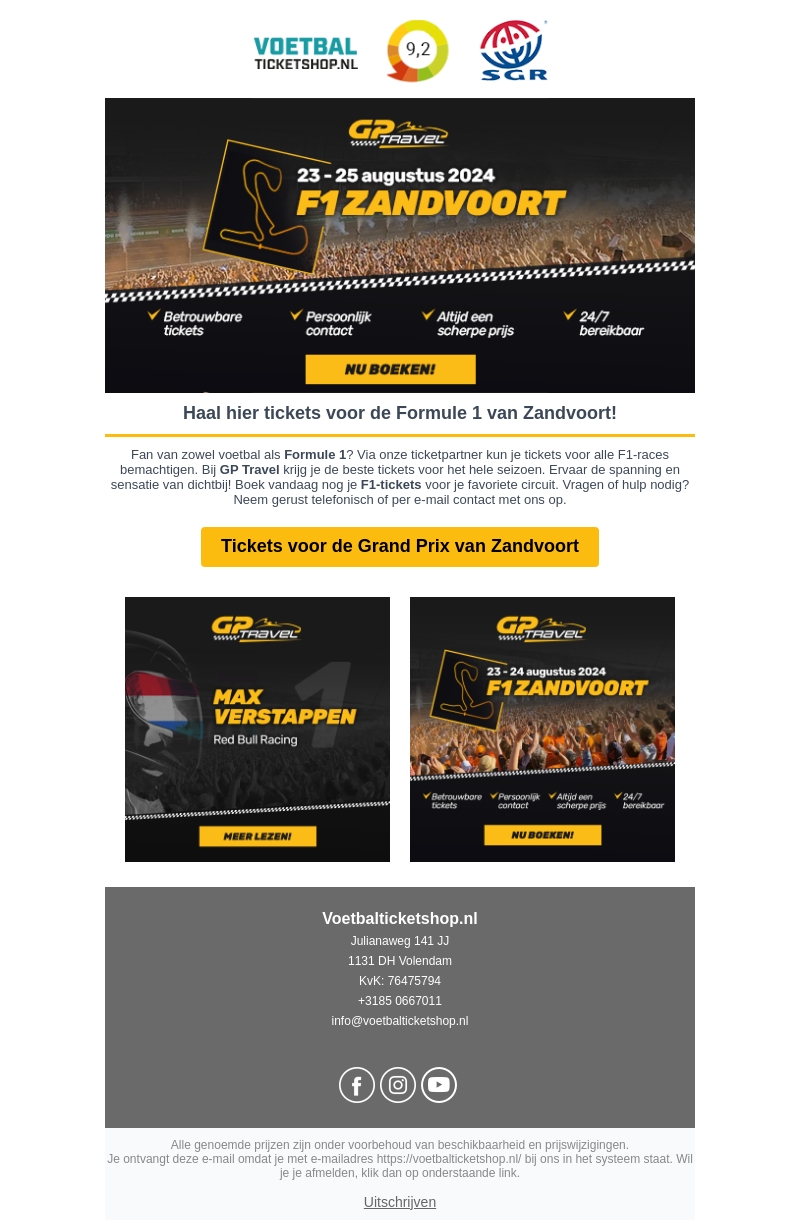 Ben jij een fan van Formule 1? Via GP Travel kun je nu F1-tickets krijgen voor het hele seizoen. Ervaar de spanning en sensatie van dichtbij bij de Formule 1 van Zandvoort van 23-25 augustus 2024. Boek nu je tickets en geniet van betrouwbare tickets, persoonlijk contact en scherpe prijzen. Neem gerust contact op voor vragen of hulp.