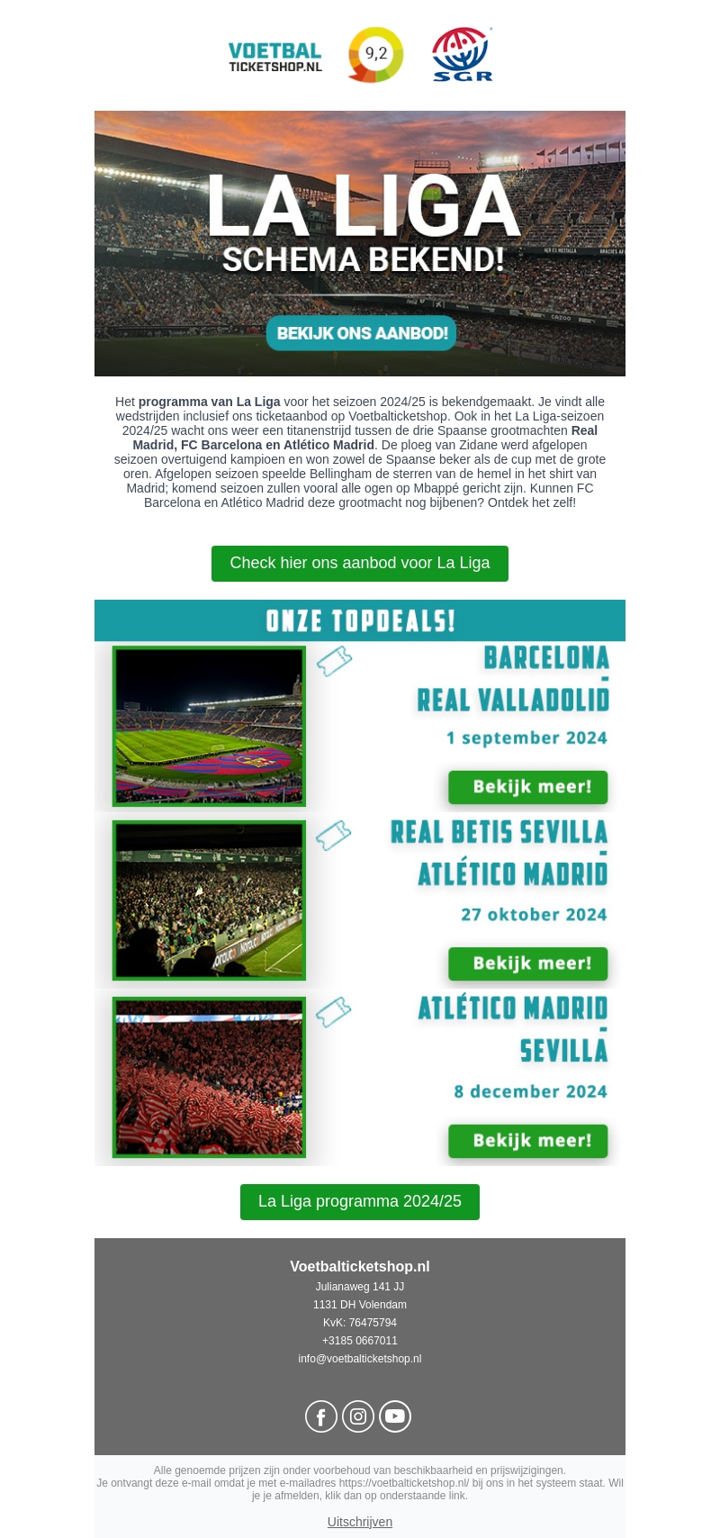 Het La Liga programma voor het seizoen 2024/25 is bekendgemaakt. Ontdek alle wedstrijden inclusief ticketaanbod op Voetbalticketshop. Beleef de spannende duels tussen Real Madrid, FC Barcelona en AtlΓ©tico Madrid. Verzeker jezelf vandaag nog van je tickets en ontdek de toppers van dit seizoen!