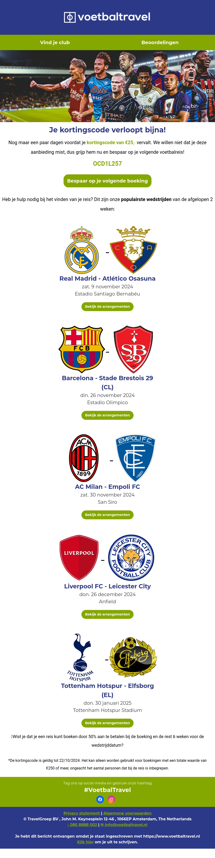 Je kortingscode van €25 verloopt binnenkort en biedt je de kans om te besparen op je volgende voetbalreis. Tijd om je favoriete club live in actie te zien met aantrekkelijke kortingen. Boek nu je arrangement voor wedstrijden van Real Madrid, Barcelona, AC Milan, Liverpool en meer. Laat deze kans niet aan je voorbijgaan en geniet van de spanning van het stadion.