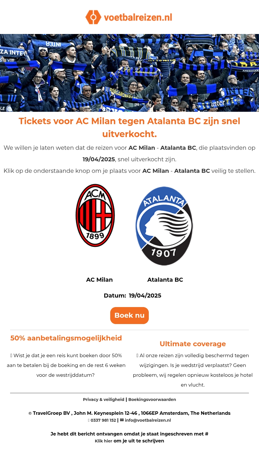 Beleef de spannende wedstrijd tussen AC Milan en Atalanta BC op 19 april 2025. Grijp je kans om tickets te boeken, aangezien ze snel uitverkocht zijn. Profiteer van onze 50% aanbetalingsmogelijkheid en ultimate coverage voor jouw gemak en zekerheid. Mis deze unieke voetbalerervaring niet, boek nu je reis. Voor meer informatie en voorwaarden, klik op 'Boek nu'.