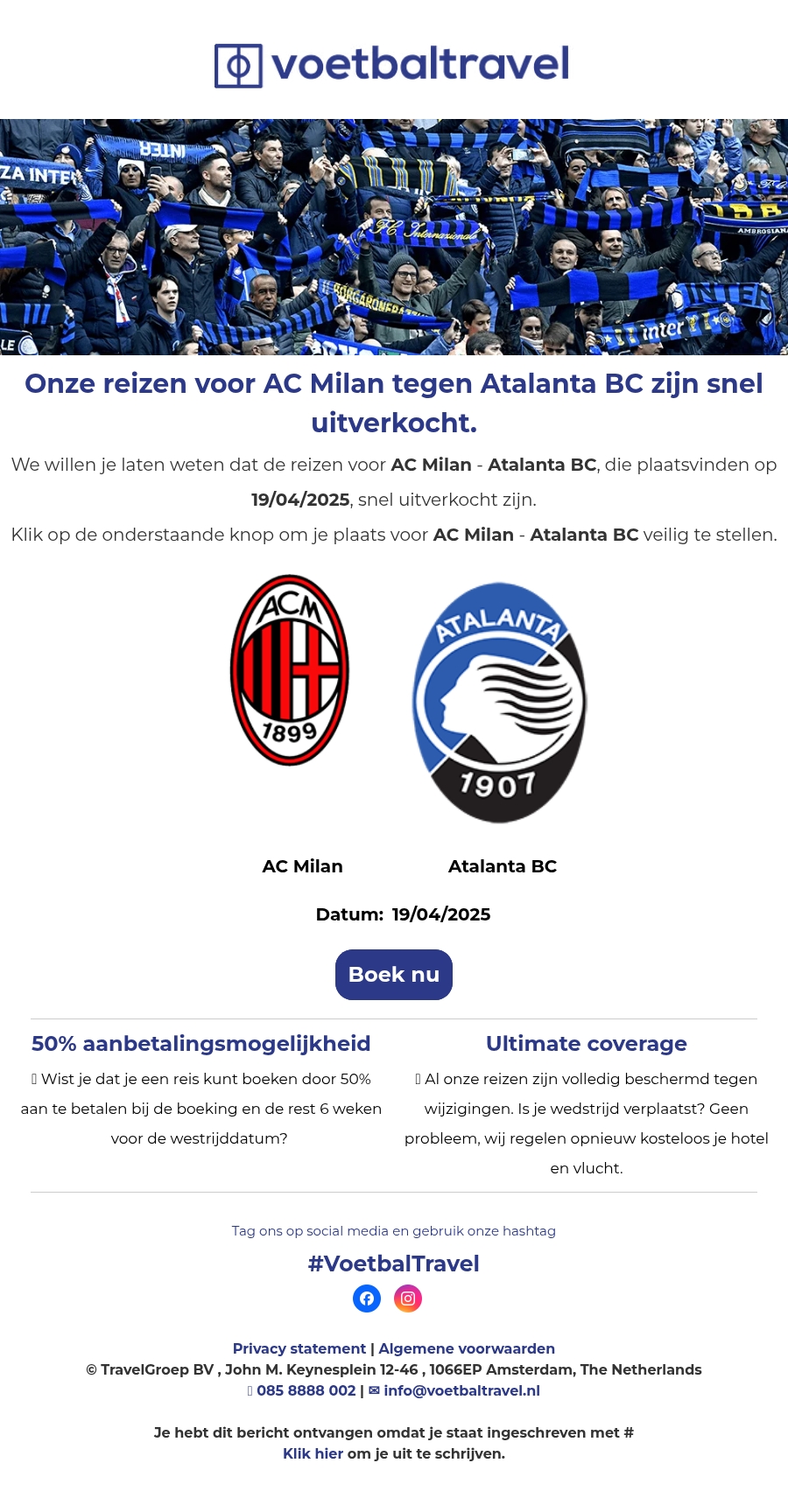 De voetbalreis naar de spannende wedstrijd tussen AC Milan en Atalanta BC is snel uitverkocht. Boek vandaag nog en verzeker je plek voor de match op 19 april 2025. Maak gebruik van de 50% aanbetalingsmogelijkheid om eenvoudig je tickets te reserveren. Alle reizen zijn inclusief volledige bescherming tegen eventuele wijzigingen.