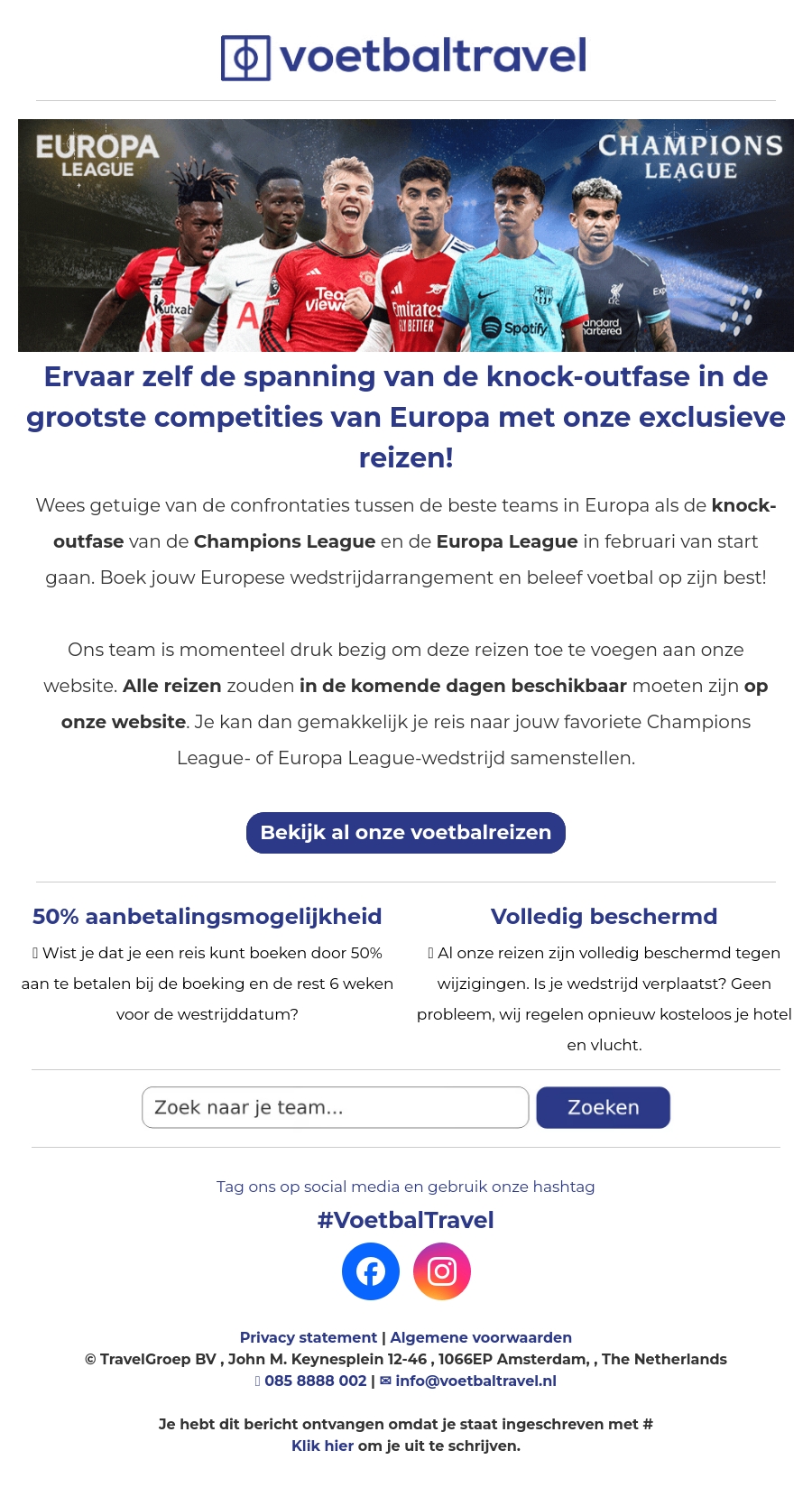 Ervaar de spannende knock-outfase van de Champions League en Europa League met exclusieve reizen van Voetbaltravel. Boek nu je Europese wedstrijdarrangement en beleef voetbal op zijn best! Ervaar de wedstrijden live in het stadion en voel de adrenaline. Al onze reizen zijn volledig beschermd tegen wijzigingen en je kan 50% aanbetalen. Stel vandaag nog je droomreis samen!
