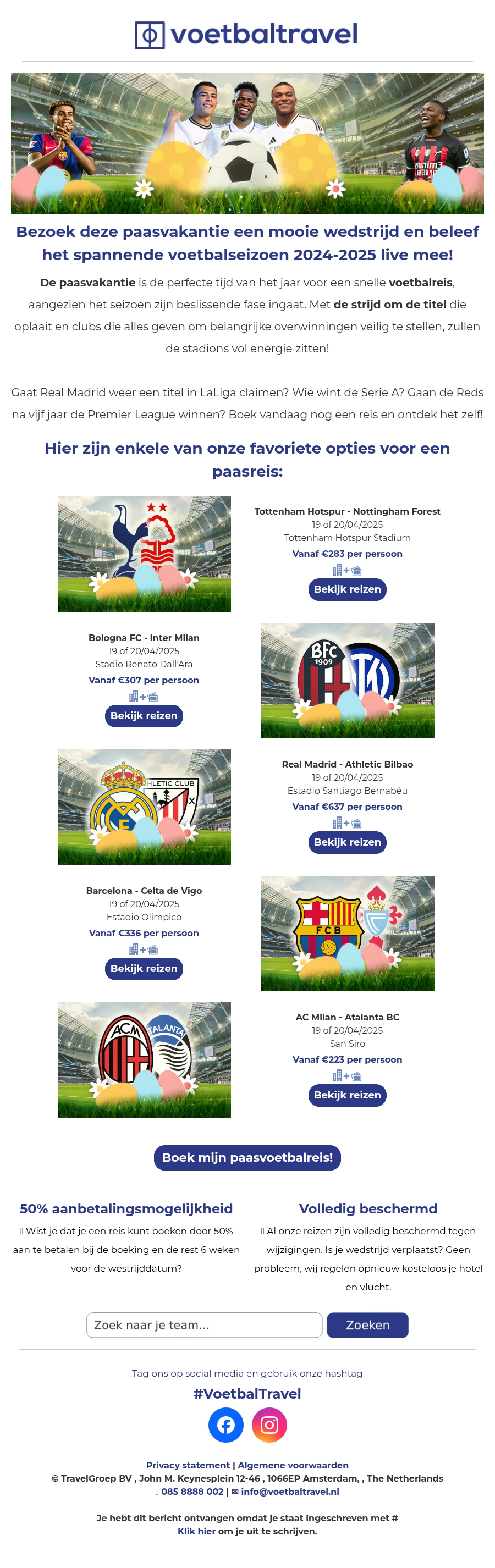 Beleef deze paasvakantie een onvergetelijke voetbalreis met VoetbalTravel. Bekijk onze selectie van spannende wedstrijden in Europa en geniet van de beslissende momenten in het seizoen 2024-2025. Boek nu je reis naar wedstrijden van teams zoals Real Madrid, Barcelona en meer. Profiteer van onze flexibele boekingsmogelijkheden inclusief 50% aanbetaling en volledige bescherming.