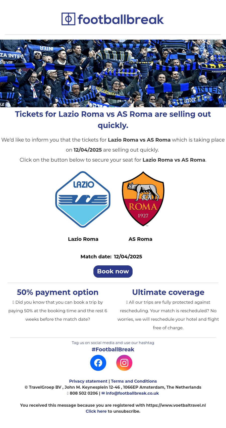 Tickets voor de spannende wedstrijd tussen Lazio Roma en AS Roma zijn bijna uitverkocht. Zorg ervoor dat je jouw plek op 12 april 2025 veiligstelt. Geniet van de mogelijkheid om met slechts 50% vooruitbetaling te reserveren en profiteer van ultieme bescherming tegen herplannen. Boek nu en wees verzekerd van een onvergetelijke ervaring.