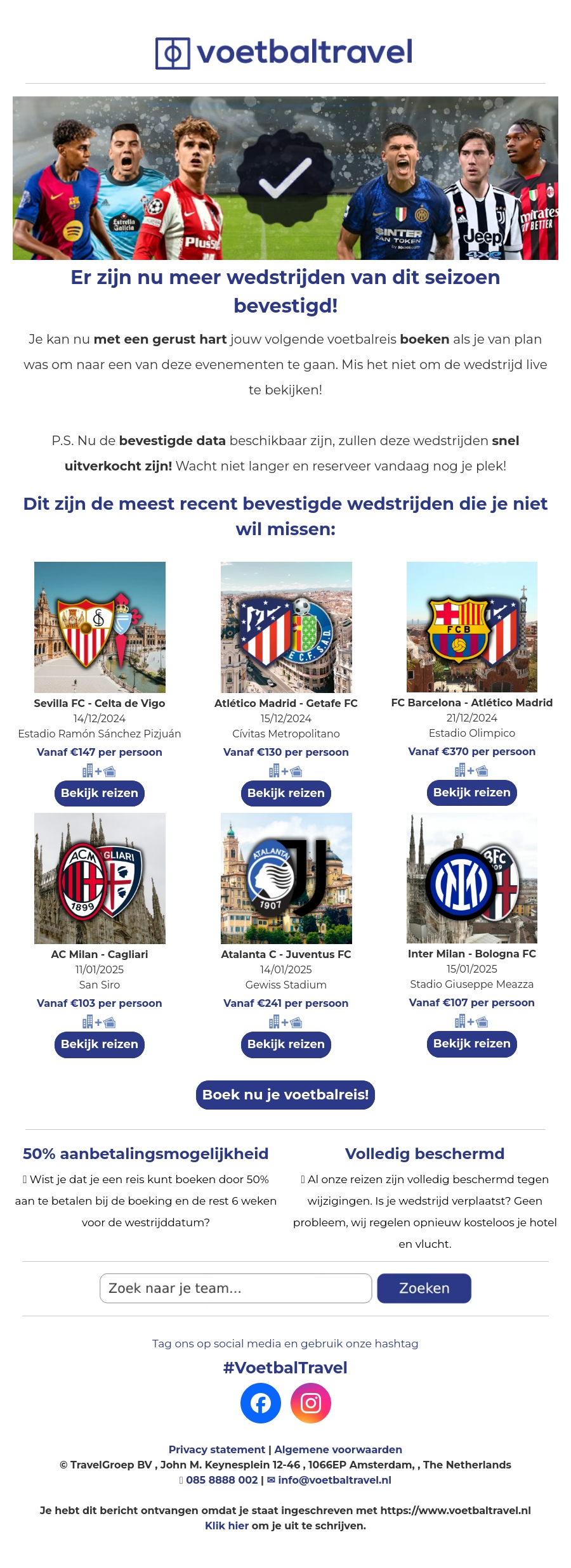 Nieuwe wedstrijden voor dit seizoen zijn nu bevestigd! Mis je kans niet om beroemde clubs live in actie te zien. Boek nu je voetbalreis met 50% aanbetaling en geniet van volledige bescherming tegen wijzigingen.
