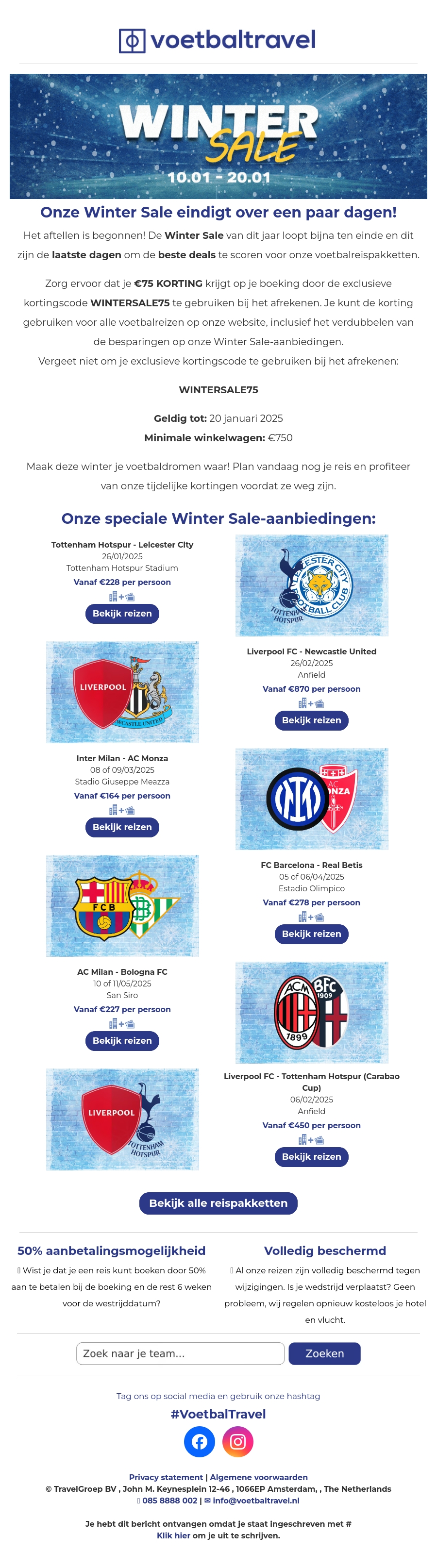 De Winter Sale van Voetbaltravel eindigt binnenkort! Dit is je kans om geweldige deals te scoren met exclusieve kortingen op voetbalreizen. Met het gebruik van kortingscode 'WINTERSALE75' ontvang je €75 korting op je boeking. Het aanbod loopt tot 20 januari 2025, dus boek je droomreis vandaag nog. Geniet van speciale aanbiedingen naar topwedstrijden en profiteer van besparingen.