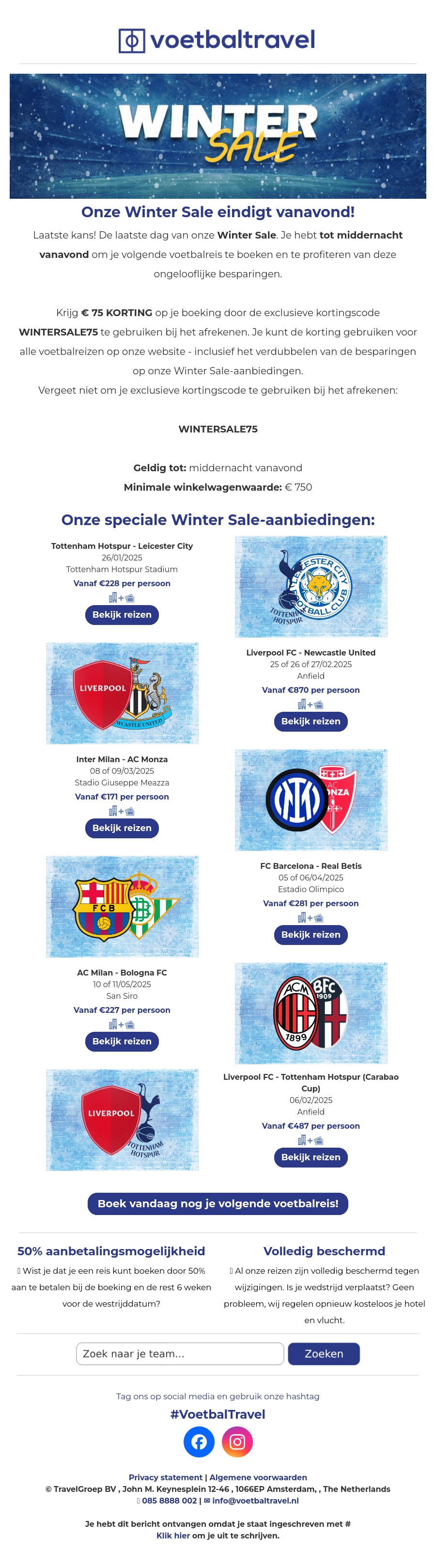 De Winter Sale van VoetbalTravel eindigt vanavond. Grijp je kans om tot middernacht geweldige kortingen te krijgen op je volgende voetbalreis. Gebruik de code WINTERSALE75 voor € 75 korting op je boeking. De aanbieding geldt voor alle reizen op de website, maar wees er snel bij, want het aanbod eindigt vannacht!