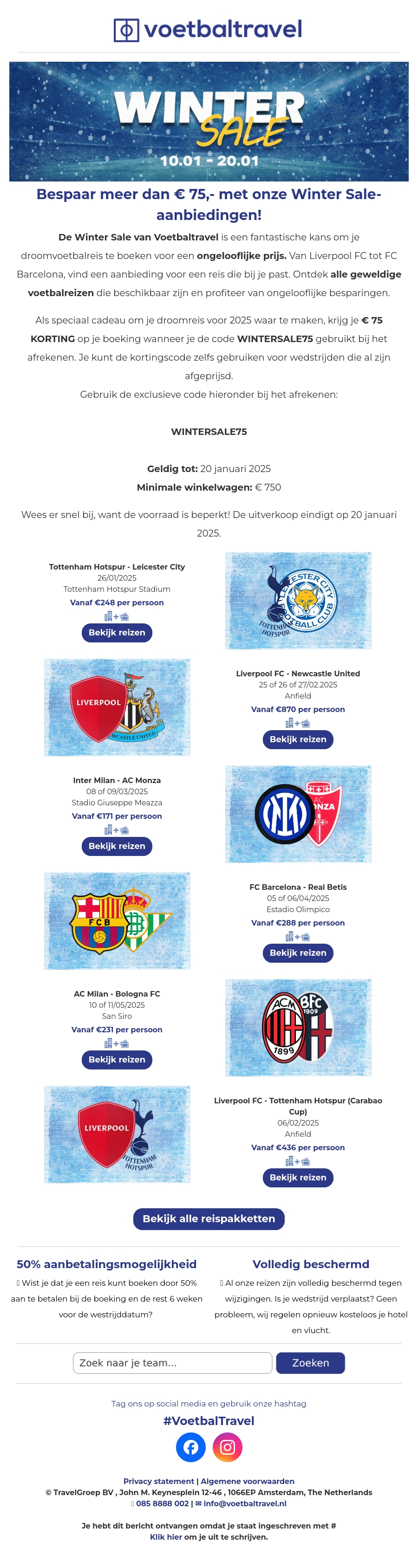 De Winter Sale van Voetbaltravel biedt de perfecte gelegenheid om je droomvoetbalreis te boeken voor een ongelofelijke prijs. Profiteer van kortingen en aantrekkelijke aanbiedingen voor topclubs zoals Liverpool FC, FC Barcelona en meer. Gebruik de code WINTERSALE75 voor extra korting. Wacht niet te lang, want de uitverkoop eindigt op 20 januari 2025.