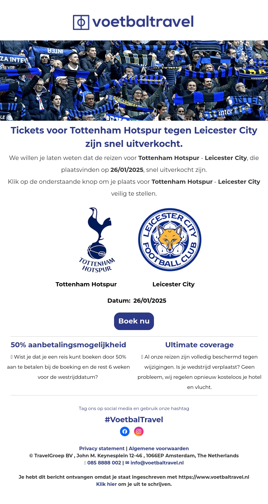 Ontdek nu de voetbalreizen naar Tottenham Hotspur tegen Leicester City op 26 januari 2025. Wees er snel bij voordat de tickets zijn uitverkocht. Geniet van flexibele aanbetalingsmogelijkheden en ultieme dekking tegen wijzigingen. Boek je plek vandaag nog en verzeker je van een geweldige ervaring.