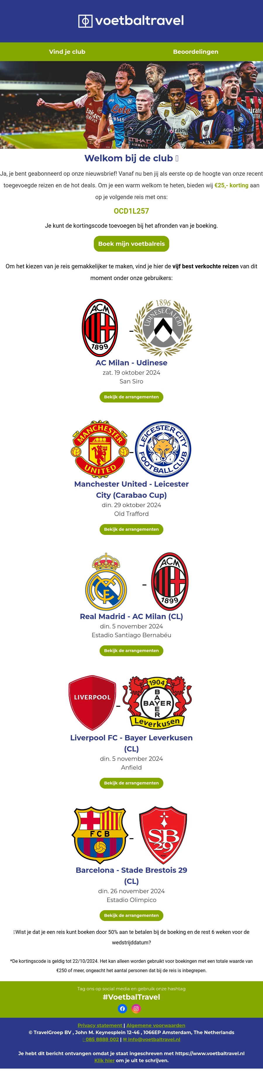 Welkom bij de club! Je bent nu geabonneerd op onze nieuwsbrief en ontvangt als eerste updates over nieuwe en hotte deals. Als welkomsgeschenk geven wij je een kortingscode van €25 op je volgende reis. Mis de kans niet om je favoriete teams live te zien spelen met speciale aanbiedingen op de best verkochte wedstrijden.