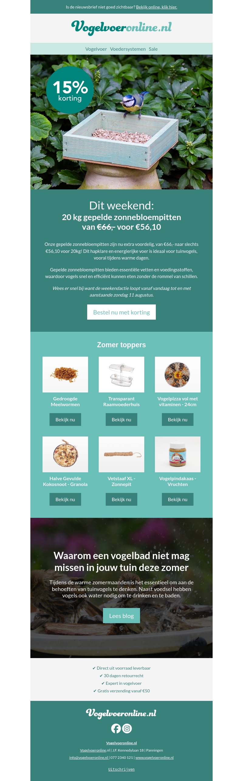 Dit weekend biedt Vogelvoeronline.nl een geweldige deal met 15% korting op 20kg gepelde zonnebloempitten, van €66,– voor slechts €56,10. Dit voedzame voer is perfect voor tuinvogels, vooral tijdens warme dagen. Mis deze kans niet om essentiële vetten en voedingsstoffen aan uw vogels te bieden zonder de rommel van schillen. Bestel nu!