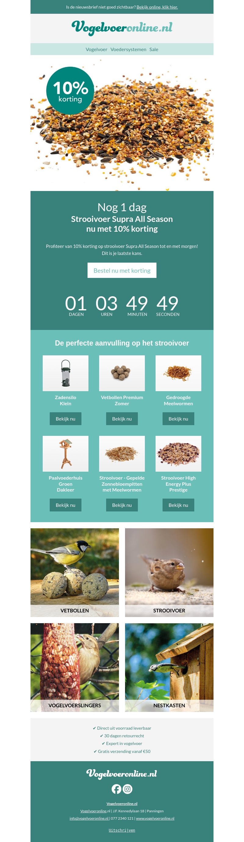 Mis deze kans niet! Slechts 1 dag over om te profiteren van 10% korting op Supra All Season strooivoer. Bestel nu en zorg voor een welkomstfeest voor de vogels in je tuin.