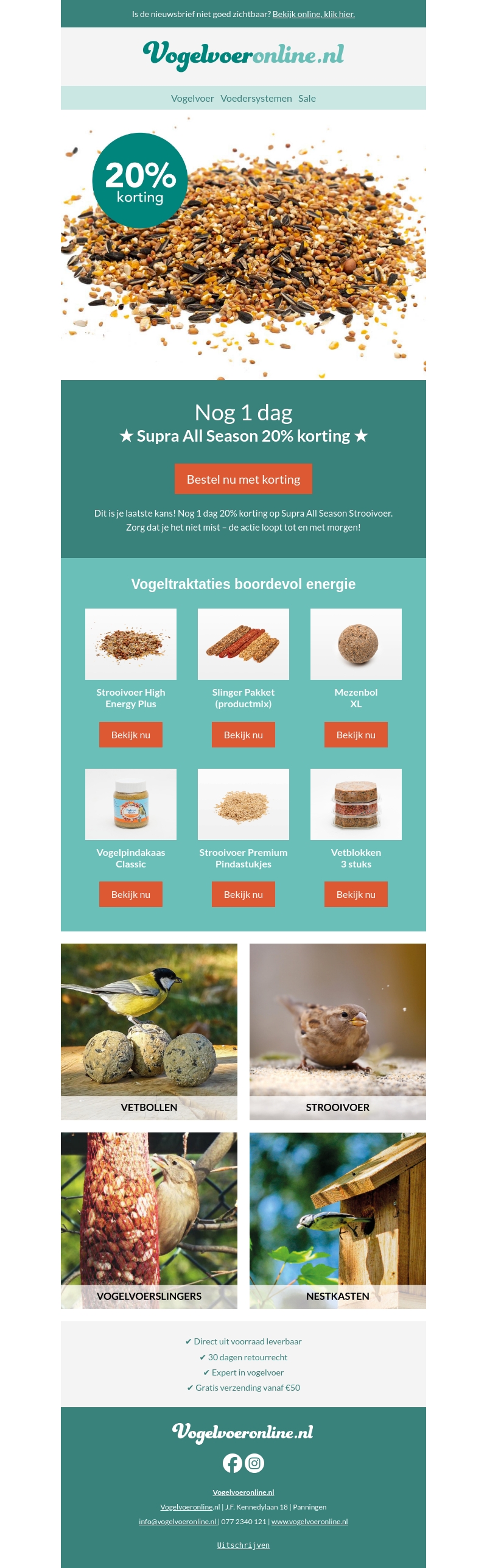 Ontvang een exclusieve korting van 20% op Supra All Season Strooivoer. Deze aanbieding is slechts één dag geldig. Bestel nu en geniet van energierijke vogeltraktaties zoals strooivoer, vetbollen en nog veel meer. Dit is je kans om je tuin vol leven te brengen. Wacht niet te lang, de actie eindigt morgen!