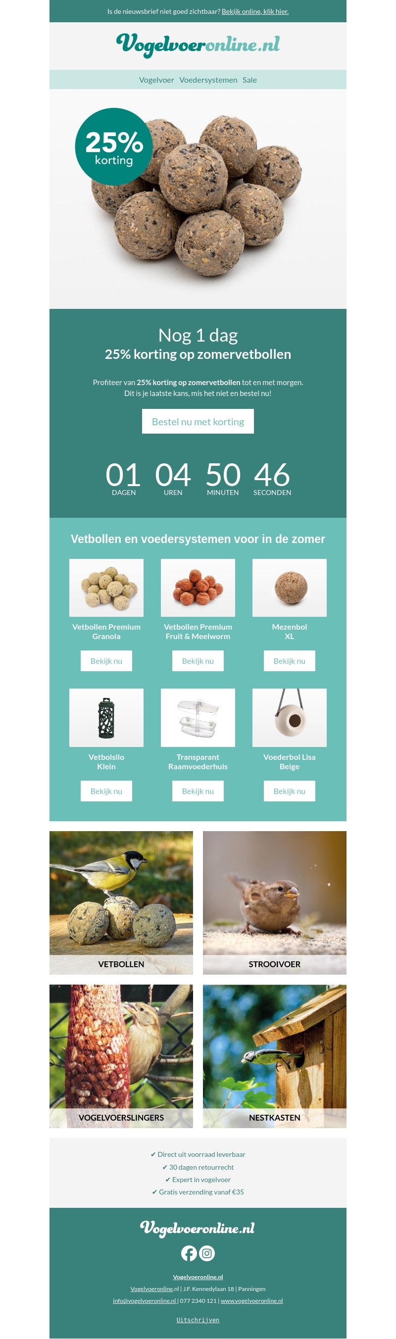 Slechts één dag over om te profiteren van 25% korting op zomervetbollen bij Vogelvoeronlin.nl! Dit is je laatste kans om je voorraad zomer vetbollen aan te vullen met een geweldige korting. Bestel nu en mis het niet.