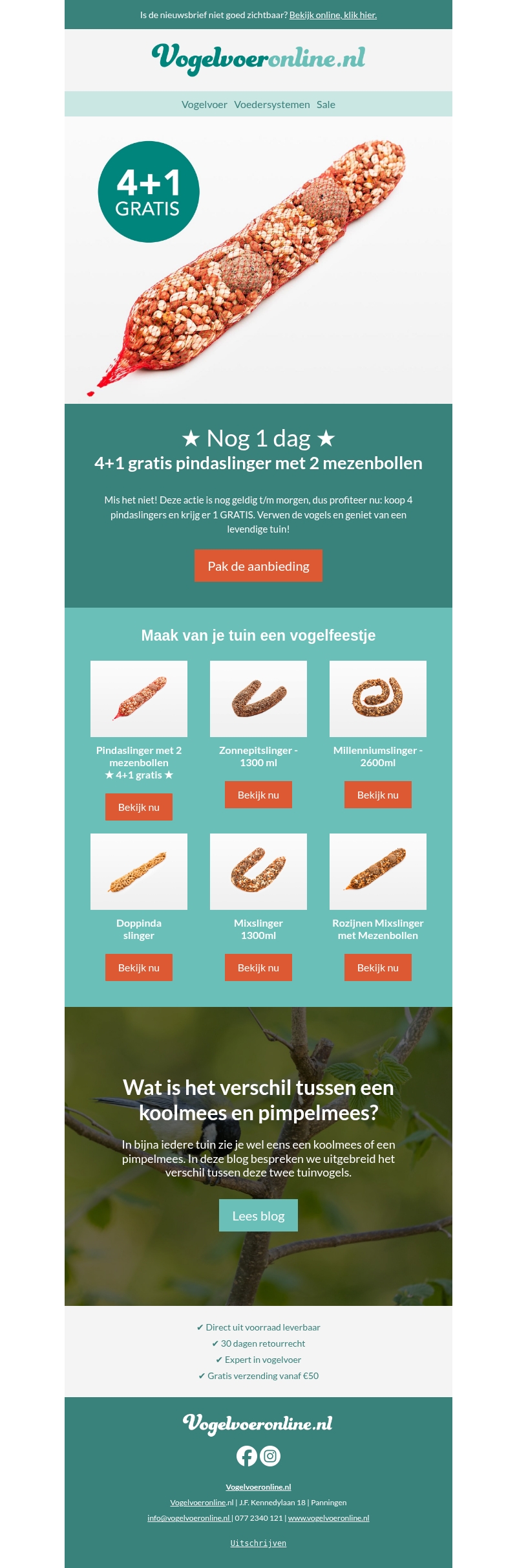 Vogelvoeronline.nl biedt een speciale aanbieding aan: koop vier pindaslingers en krijg er één gratis! Deze actie is slechts één dag geldig, dus profiteer snel. Met deze pindaslingers trek je gemakkelijk vogels naar je tuin. Geniet van een levendige omgeving terwijl je vogels voert en observeert. Ook verkrijgbaar zijn zonnebloempitslingers en dopslinger, perfect voor een tuin vol vogels!