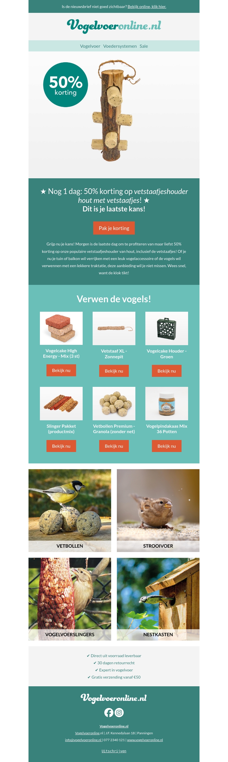 Grijp nu je kans voor de vetstaafjeshouder met 50% korting! Dit is je laatste kans om je tuin te verrijken met deze exclusieve vogelaccessoire. Profiteer nog 1 dag van deze geweldige aanbieding en verwelkom meer vogels in je tuin. Wees snel, want de klok tikt! Bezoek onze website en ontdek meer vogelproducten.