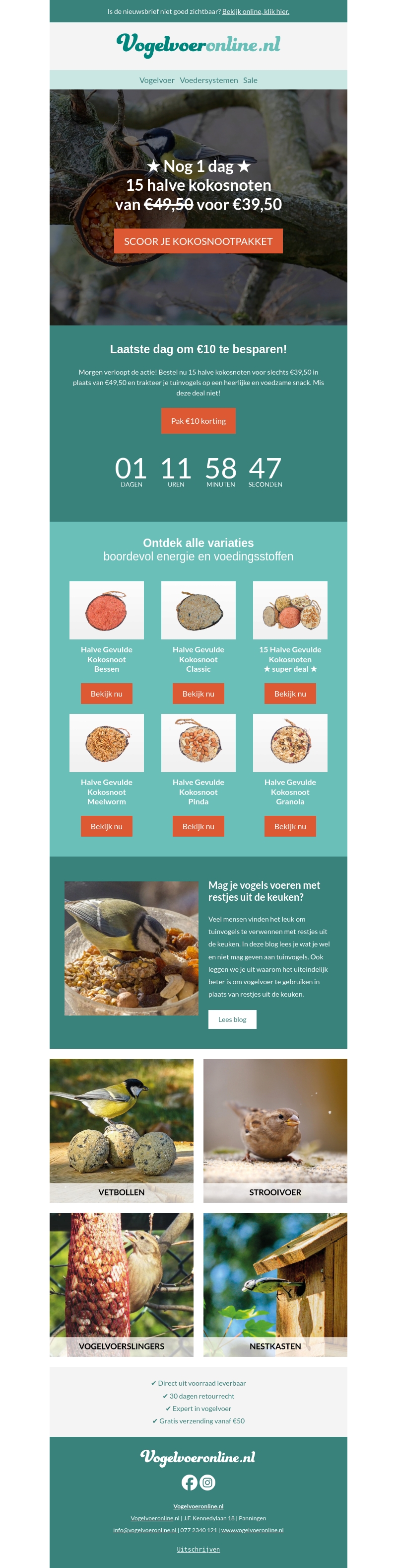 Morgen vervalt deze geweldige aanbieding: krijg 15 halve gevulde kokosnoten voor slechts €39,50 in plaats van €49,50. Deze voedzame snack is perfect voor tuinvogels en biedt hen de nodige energie en voedingsstoffen. Mis deze kans niet om je tuinbezoekers blij te maken met een heerlijke traktatie. Ontdek ook andere variaties zoals bessen, pinda's en granola. Verrijk je tuin met deze unieke kokosnootproducten!