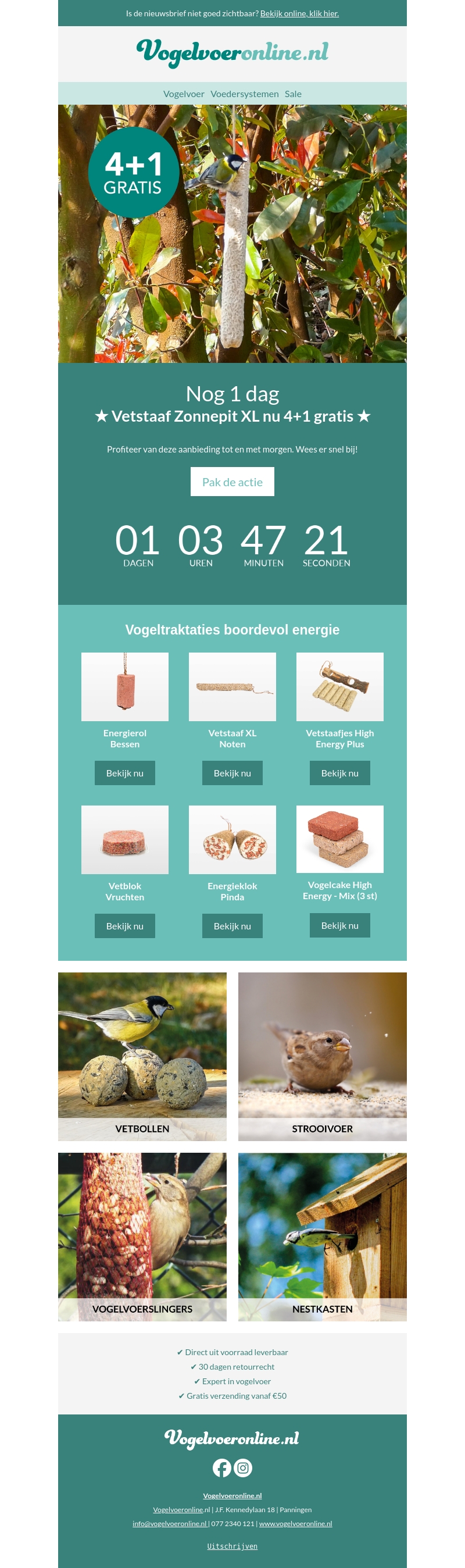 Profiteer van de 4+1 gratis aanbieding op Vetstaaf Zonnepit XL. Deze actie is nog 1 dag geldig. Haal snel jouw vetrijke vogeltraktaties boordevol energie binnen en zorg dat de vogels in jouw tuin niets tekortkomen.