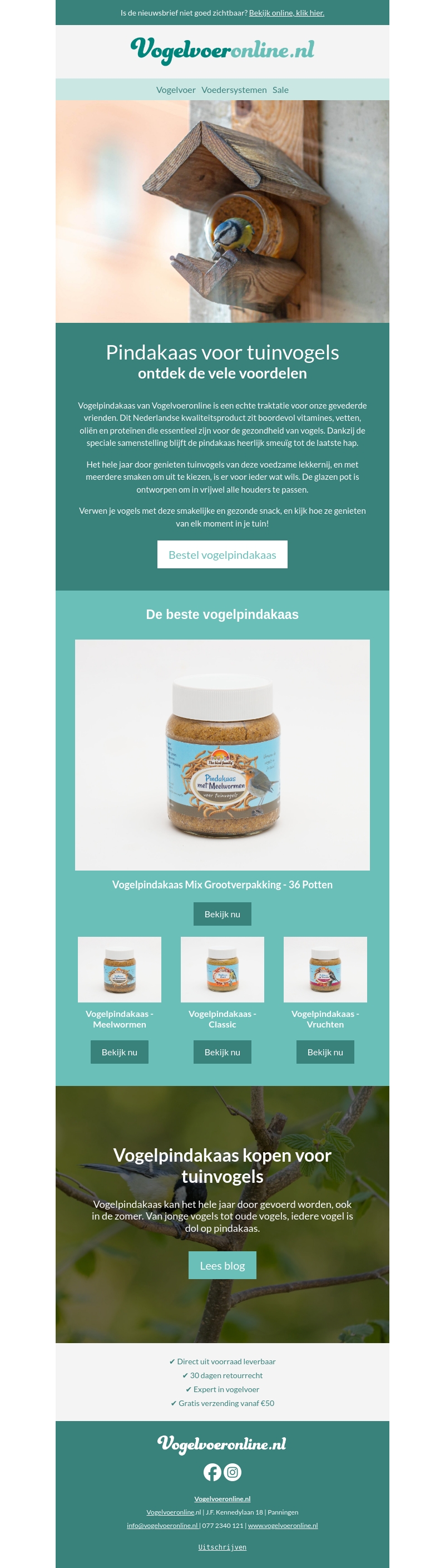 Onze vogelpindakaas is een echte traktatie voor tuinvogels. Boordevol vitamines, vetten, oliën en proteïnen, is het ideaal voor hun gezondheid. De smeuïge textuur en veelzijdige smaken maken het een favoriet onder vogels.