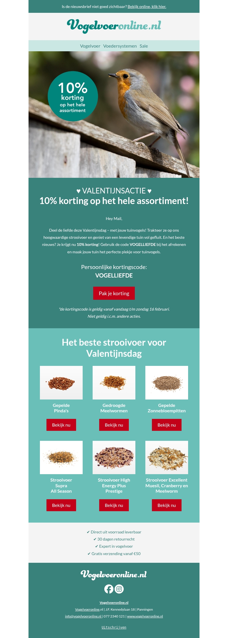 Verrijk uw tuin met de liefde deze Valentijnsdag met een speciale korting van 10% op het volledige assortiment bij Vogelvoeronline.nl. Gebruik de code VOGELLIEFDE en creëer een vogelparadijs in uw tuin. Inclusief verschillende soorten strooivoer van hoge kwaliteit voor tuinvogels.