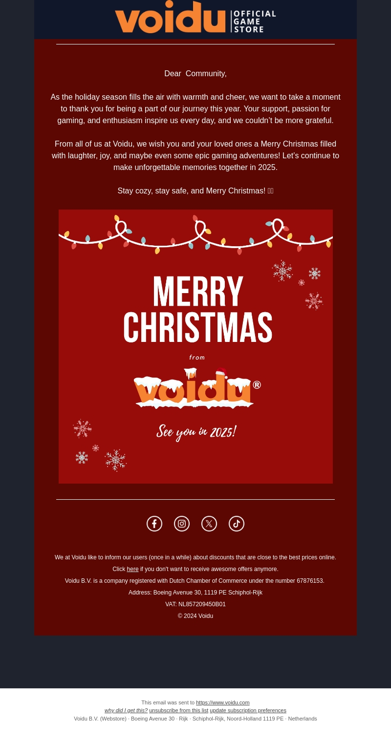 Voidu wenst jou een prachtige kerst vol warmte en vrolijkheid! Geniet van de feestdagen met gezellige gaming momenten en maak je klaar voor een avontuurlijk nieuw jaar. Bedankt voor je steun en passie voor gaming. Laten we samen onvergetelijke herinneringen maken in 2025. Blijf warm en veilig deze feestdagen!