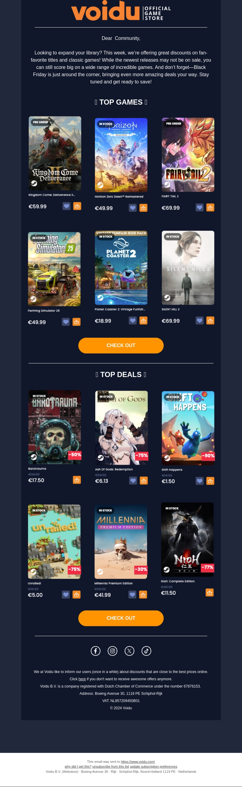 Voidu biedt deze week aanzienlijke kortingen op favoriete titels en klassieke games. Mis de kans niet om grote besparingen te maken tot aan Black Friday. Deze nieuwsbrief toont topgames zoals 'Kingdom Come: Deliverance II', 'Horizon Zero Dawn Remastered' en meer. Ontdek ook ongelofelijke aanbiedingen met kortingen tot 90% op titels zoals 'Barotrauma' en 'Shirt Happens'. Bereid je voor op nog spannendere deals rond Black Friday. Blijf op de hoogte en bespaar meer!