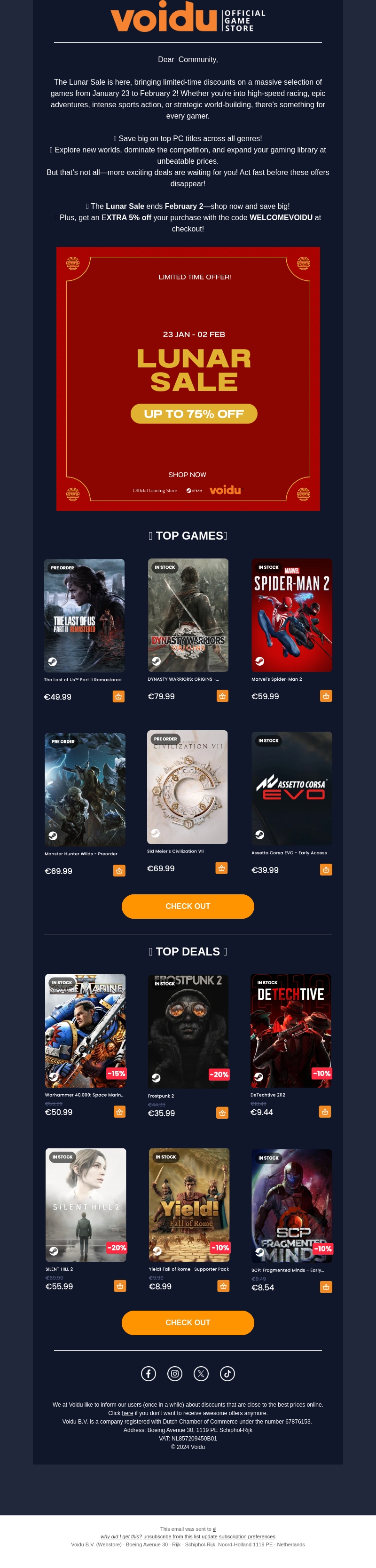 De Lunar Sale biedt geweldige kortingen op een breed scala aan games van 23 januari tot 2 februari. Duik in snelheidsraces, epische avonturen, intense sportactie of strategische wereldbouw. Bezoek onze winkel en geniet van topproducten tegen de beste prijzen. Mis deze kans om je gamecollectie uit te breiden niet. Pak ook een extra 5% korting met de code WELCOMEVOIDU!