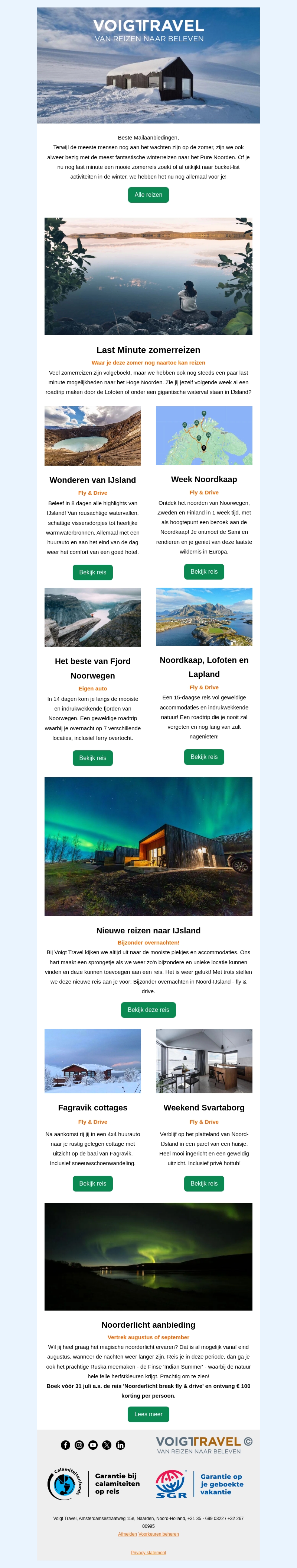 Voigt Travel presenteert nieuwe en unieke bestemmingen in IJsland. Beleef last-minute zomereizen, ontdek de wonderen van IJsland, en plan je avontuur in Noordkaap, Lofoten en Lapland. Profiteer van speciale aanbiedingen waaronder de betoverende noorderlicht ervaring. Misk deze buitenkans niet!