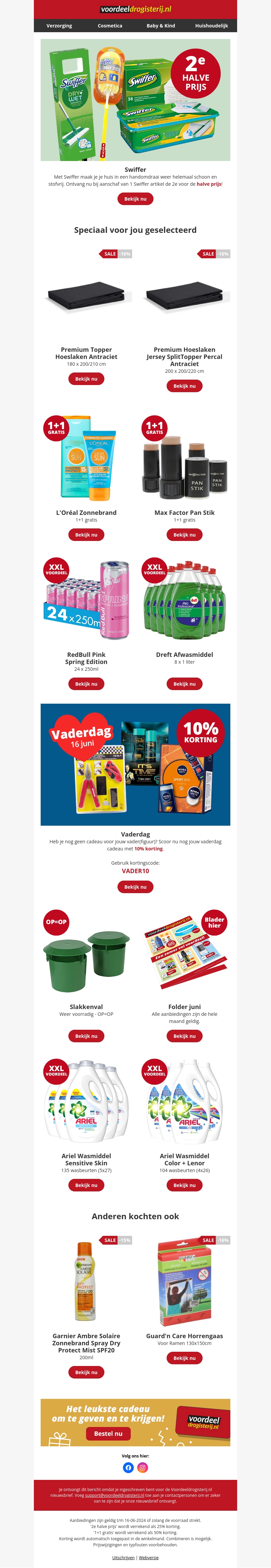 Profiteer van onze speciale aanbiedingen bij Voordeeldrogisterij.nl! Deze week heeft Swiffer een 2e artikel voor halve prijs en L'Oréal Zonnebrand 1+1 gratis. Mis ook niet andere geweldige deals zoals Max Factor Pan Stik 1+1 gratis, XXL voordeel RedBull en Dreft afwasmiddel.