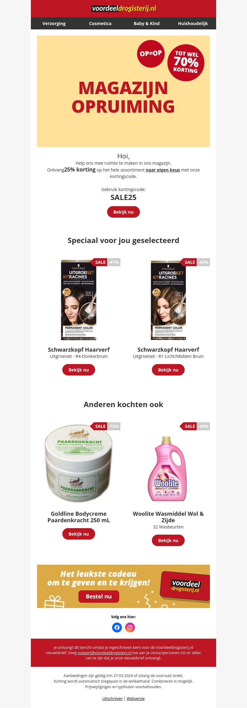 Help mee ruimte te maken in ons magazijn met onze grote magazijn opruiming! Ontvang tot wel 70% korting op diverse producten. Speciaal voor jou geselecteerde aanbiedingen waaronder Schwarzkopf Haarverf, Goldline Bodycreme en Woolite Wasmiddel. Gebruik kortingscode SALE25 voor extra korting.