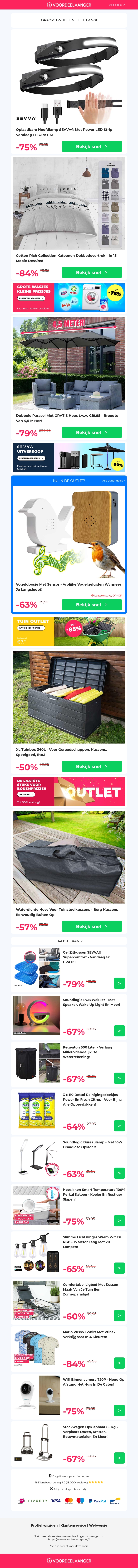 π 1+1 GRATIS: Oplaadbare Hoofdlamp (-75% Korting) / Katoenen Dekbedovertrek / Dubbele Parasol Actie / XL Tuinbox / Tuinstoelkussen Hoes