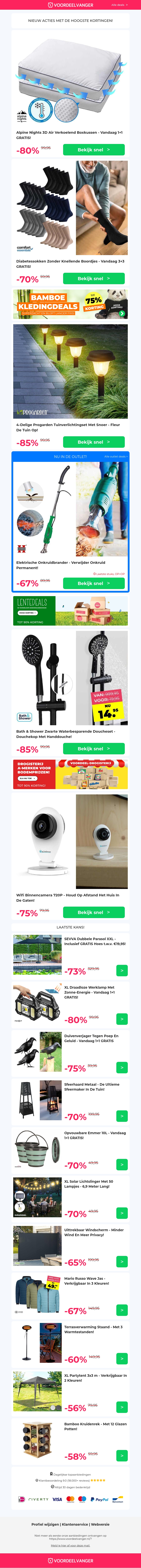 Duik in onze exclusieve deals met het Verkoelend 3D Air Boxkussen, Diabetes Anti-Knel Sokken, tuinverlichting, besparende douchesets en een handige wifi binnencamera. Deze week 1+1 gratis en scherpe kortingen op geselecteerde producten. Mis het niet en shop direct!