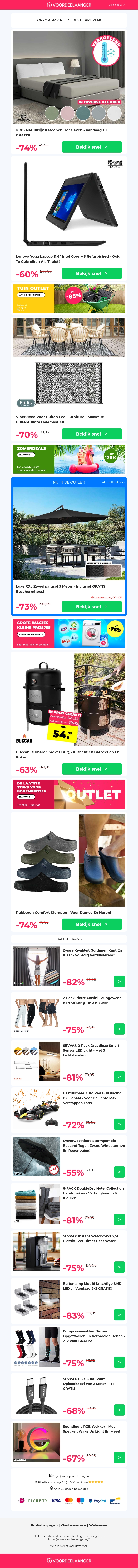 Mis deze geweldige aanbiedingen niet! Profiteer nu van 2 halen 1 betalen op verkoelende hoeslakens, korting op de Lenovo Yoga Laptop, trendy vloerkleden, veelzijdige smoker BBQ's en comfortabele klompen. Bekijk de deals en bespaar flink op de nieuwste producten voor je huis en tuin.
