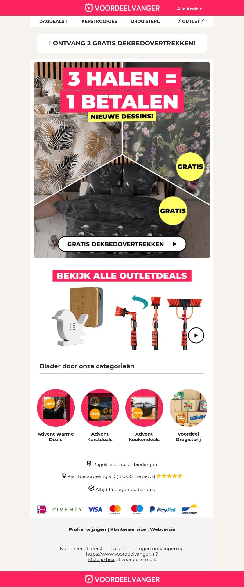 Voordeelvanger biedt een geweldige aanbieding: koop drie dekbedovertrekken en betaal er slechts één! Ontdek de nieuwste designs en maak uw slaapkamer stijlvol voor minder. Deze aanbieding geldt voor een beperkte tijd, dus wees er snel bij. Naast dekbedovertrekken kunt u ook een kijkje nemen in onze outlet voor meer geweldige deals. Klik op de link en bespaar nu!