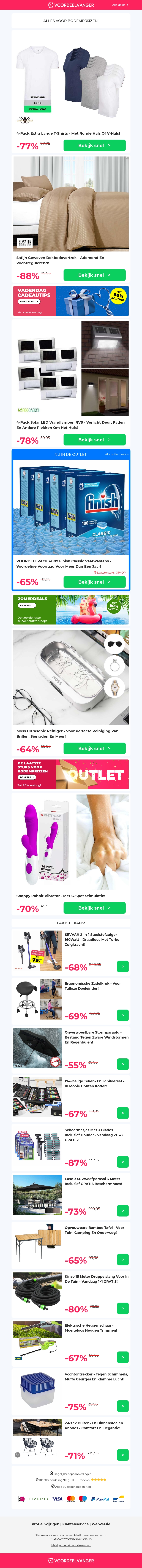 Bekijk onze aanbiedingen van deze week inclusief 4-Pack Extra Lange T-Shirts met 77% korting, hoogwaardige dekbedovertrekken, en praktische Solar LED Wandlampen. Haal nu de beste deals binnen en bespaar groot!