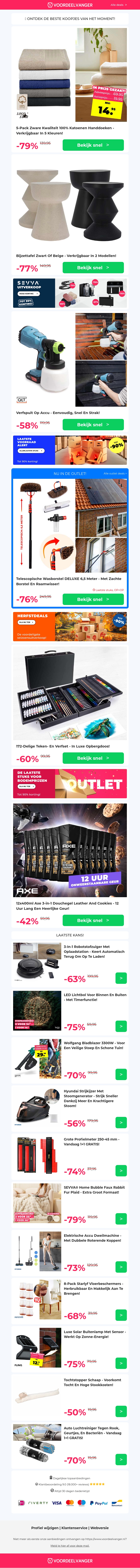 Profiteer van €5 extra korting op een 5-pack handdoeken, een stijlvolle bijzettafel en een handige accu verfspuit. Ook verkrijgbaar: een uitgebreide tekenset en Axe douchegel. Ontdek deze aanbiedingen en meer, en bespaar flink op je aankopen.