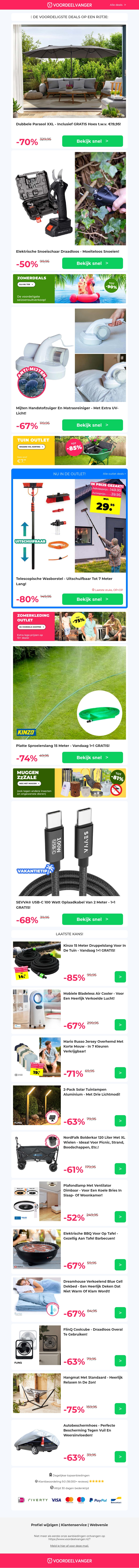 Ontdek de nieuwste kortingen van Voordeelvanger.nl, waaronder tot wel 70% korting op de Dubbele Parasol XXL, 50% op een elektrische snoeischaar en nog veel meer. Perfect om je tuin zomer-klaar te maken met premium producten tegen gereduceerde prijzen. Beperkte voorraad, dus wees er snel bij!