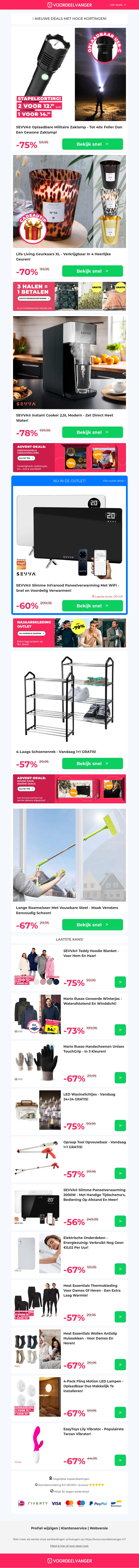 Ontdek geweldige kortingen tot 75% op een breed scala aan producten. Geniet van aanbiedingen zoals de oplaadbare zaklamp, luxueuze geurkaarsen in verschillende geuren, een praktische instant cooker en meer. Maak uw huis georganiseerd met het handige schoenenrek 1+1 aanbieding en maak ramen glanzend schoon met de raamwisser. Mis deze fantastische deals niet!