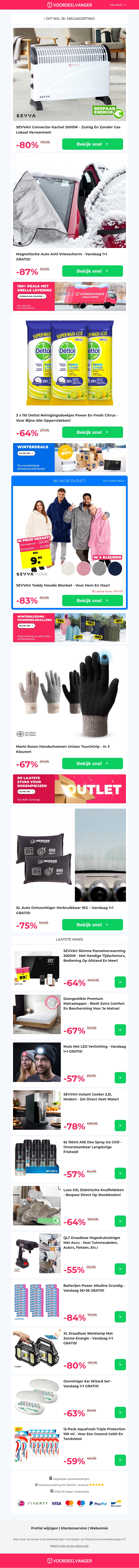 Ontdek een breed scala aan voordelige producten, waaronder een convector kachel met 80% korting, anti-vriesschermen met 87% korting, en Dettol reinigingsdoekjes. Laat de winterkou buiten met onze verwarmende aanbiedingen en blijf binnen lekker warm. Mis ook de extra hygiënische deals niet voor een schoon en veilig huis. Perfect voor het beschermen van uw auto met onze ontvochtiger. Profiteer nu van deze exclusieve kortingen.