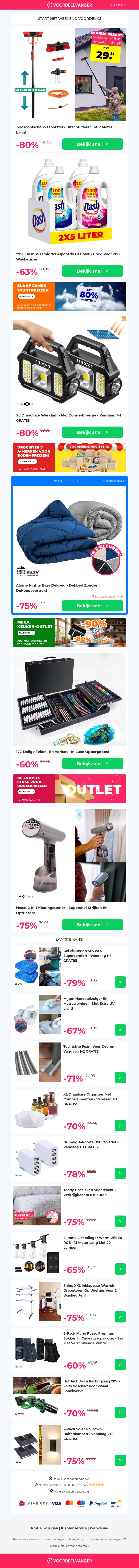 Ontvang tot 80% korting op een selectie van handige producten. Van telescopische wasborstels en Dash wasmiddel tot draadloze werklampen en kledingstomers. Profiteer van deze aanbiedingen en bespaar groots. Mis deze kans niet om kwaliteitsproducten in huis te halen tegen scherpe prijzen.