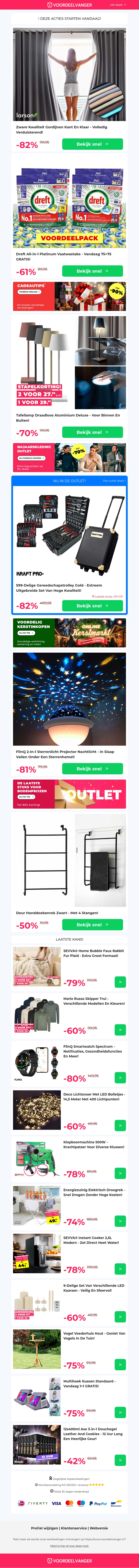 Profiteer van spectaculaire kortingen tot wel 82% op een breed scala aan producten. Of je nu op zoek bent naar zware kwaliteit gordijnen, handige Dreft tabs, stijlvolle tafellampen, of een sterrenlicht projector, je vindt het allemaal in onze nieuwste nieuwsbrief. Mis ook het handdoekenrek en andere geweldige aanbiedingen niet. Haast je, want deze deals zijn maar tijdelijk beschikbaar!
